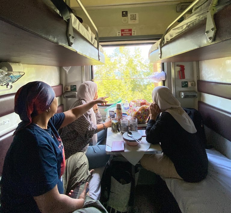 Hari ini kita berada di dalam Trans-Siberia train sepanjang hari. Perjalanan agak panjang, tetapi suasananya tenang dan selesa. Sepanjang laluan, kita dapat melihat pemandangan hutan, sungai dan kampung kecil yang menjadi sebahagian daripada kehidupan di Rusia.